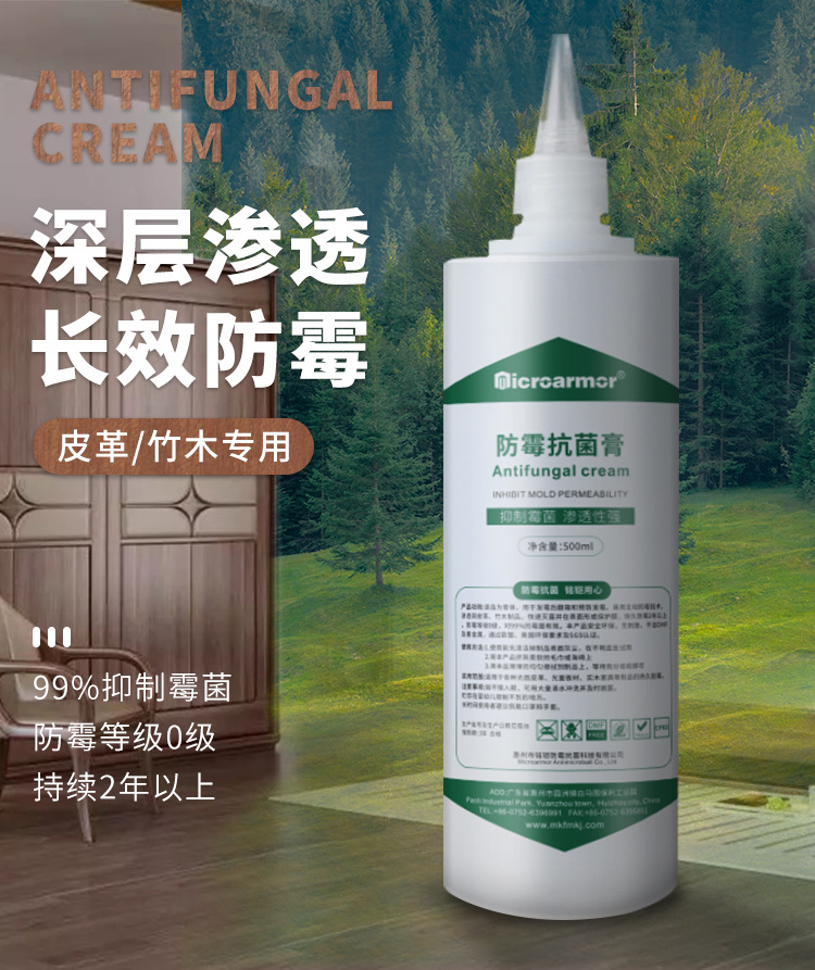 防霉抗菌剂膏深层渗透、长效防霉,抑制霉菌,使用后能快速灭菌,形成保护层,适用范围:竹木制品、光面皮革,实木家具,防霉等级0级,持续防霉可达2年,